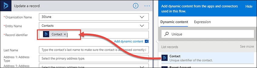 Step 16: Once you have completed the above, click in the ‘Record Identifier’ field and when the dynamic content pane appears select ‘Contact’ (Description: Unique identifier of the contact).